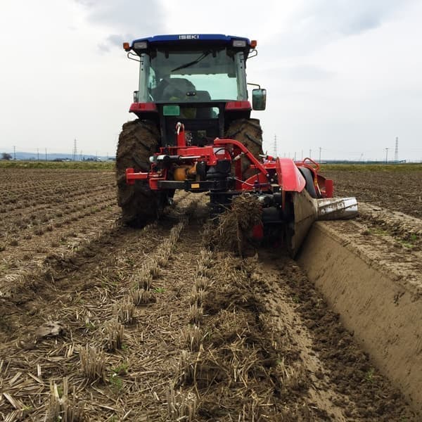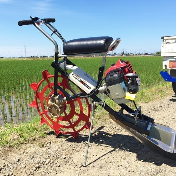 その中干し作業で入水・排水がスムーズに出来る様に、溝切り機に乗って溝を作ります。