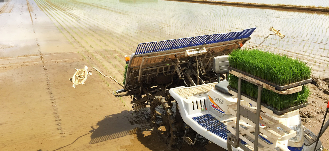 ハウスで育てた苗を田んぼに運び出し、田植え機でその苗を植えます。